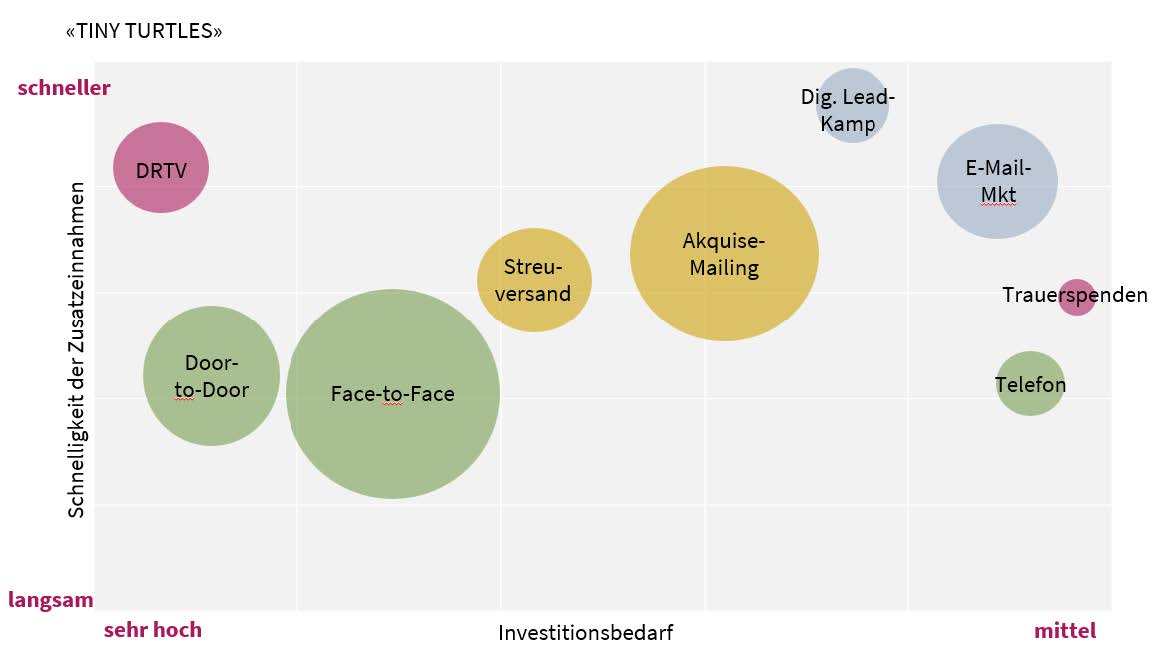 Der Entscheid für oder gegen ein Instrument hängt einerseits davon ab, wie viel Investitionskapital eine Organisation einsetzen und wie lange sie warten kann, bis der Break-even erreicht wird. Andererseits hängt die Wahl des Kanals auch davon ab, welche Zielgruppen im Fokus der Fundraisingstrategie stehen. Und: Nicht jeder Kanal und jede Massnahme passen zu jeder Organisation.